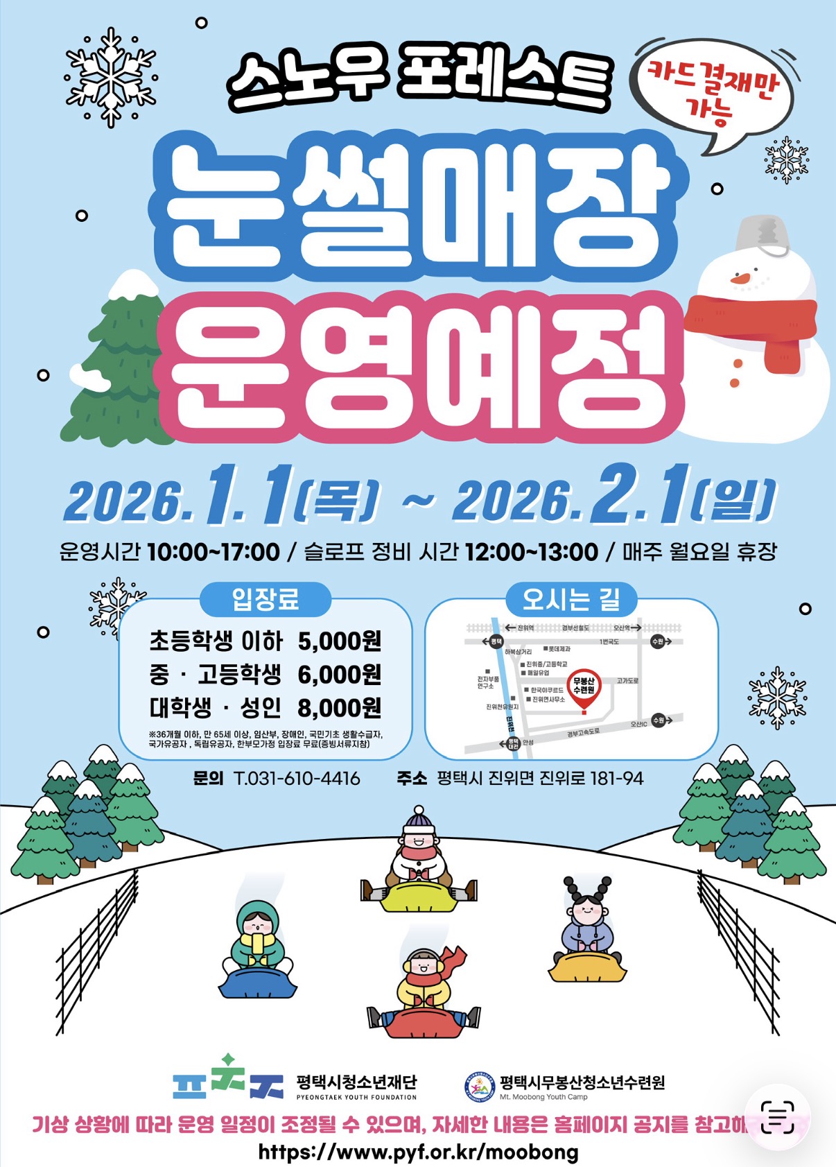 ❄️ 3. 평택 – 무봉산청소년수련원 눈썰매장